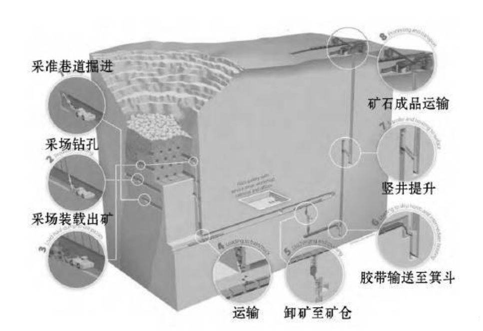 1)开拓。基律纳铁矿采用竖井+斜坡道联合开拓,矿山有3条竖井,用于通风、矿石和废石的提升,人员、设备和材料主要用无轨设备从斜坡道运送。主提升竖井位于矿体的下盘,到目前为止,采掘面和主运输系统已经下移了6次,目前的主要运输水平在1045m水平。